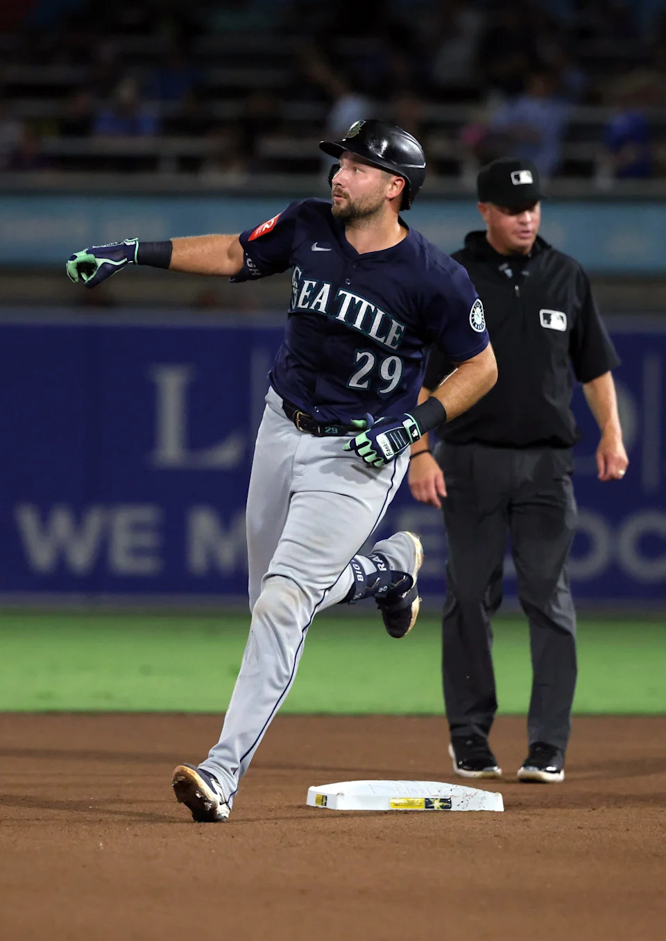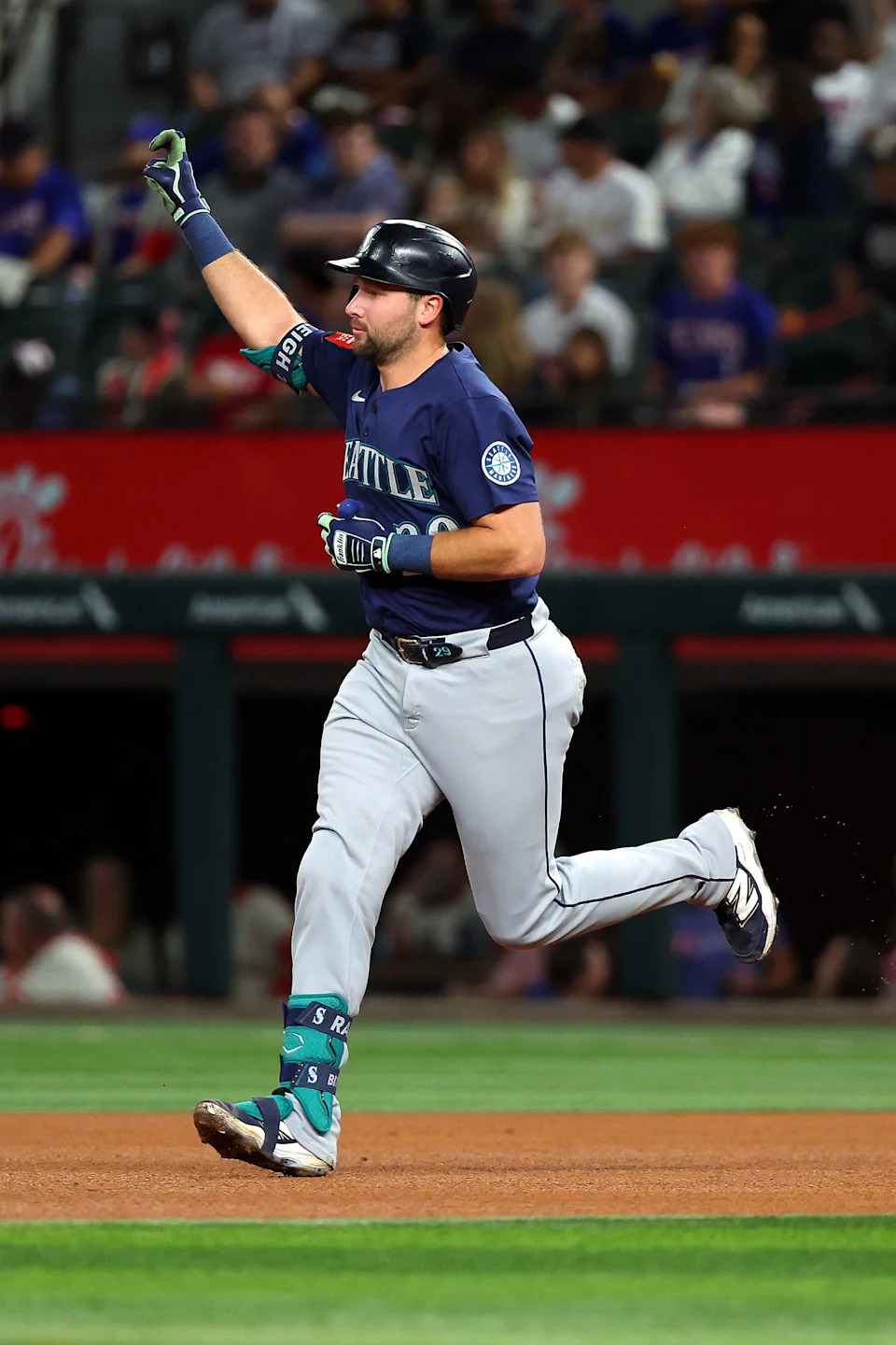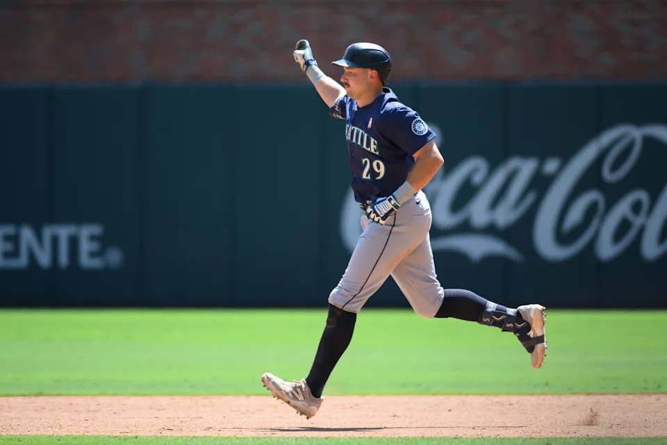 Cal Raleigh of the Seattle Mariners runs to second base after hitting a three-run home run against the Atlanta Braves at Truist Park on Sept. 7, 2025, in Atlanta. The ninth-inning homer was Raleigh’s 53rd of the season.