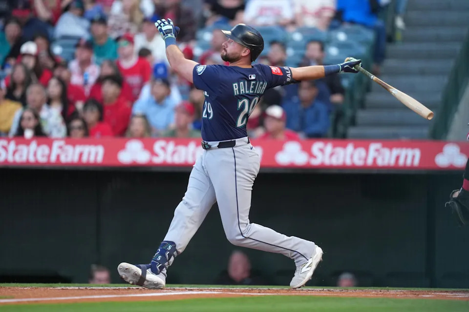 Seattle Mariners catcher Cal Raleigh hits a home run during the seventh inning against the Los Angeles Angels at Angel Stadium in Anaheim, California, on July 27, 2025. The seventh-inning solo shot marked Raleigh’s 41st home run of the season.