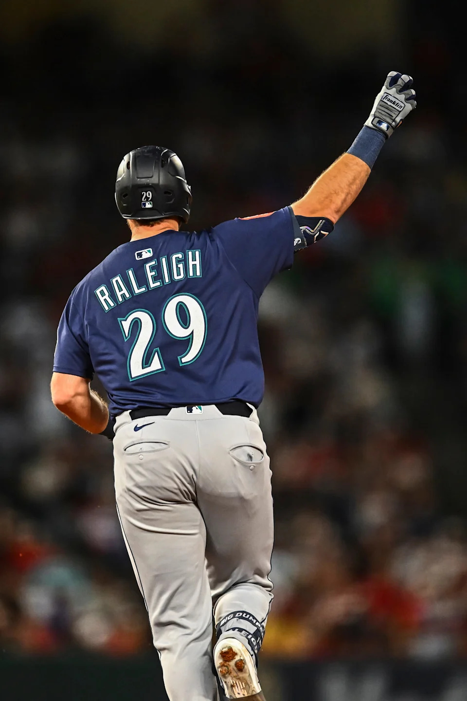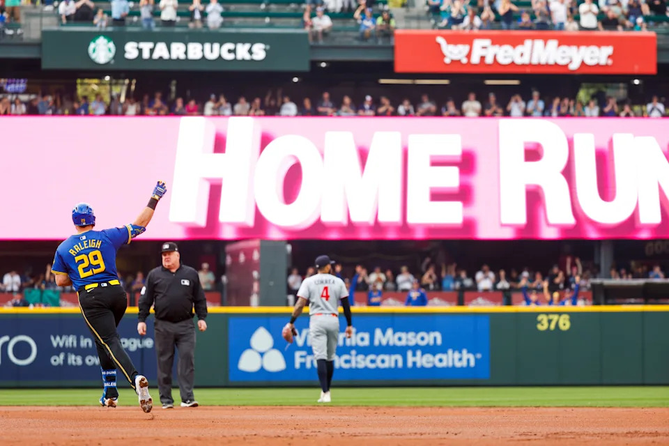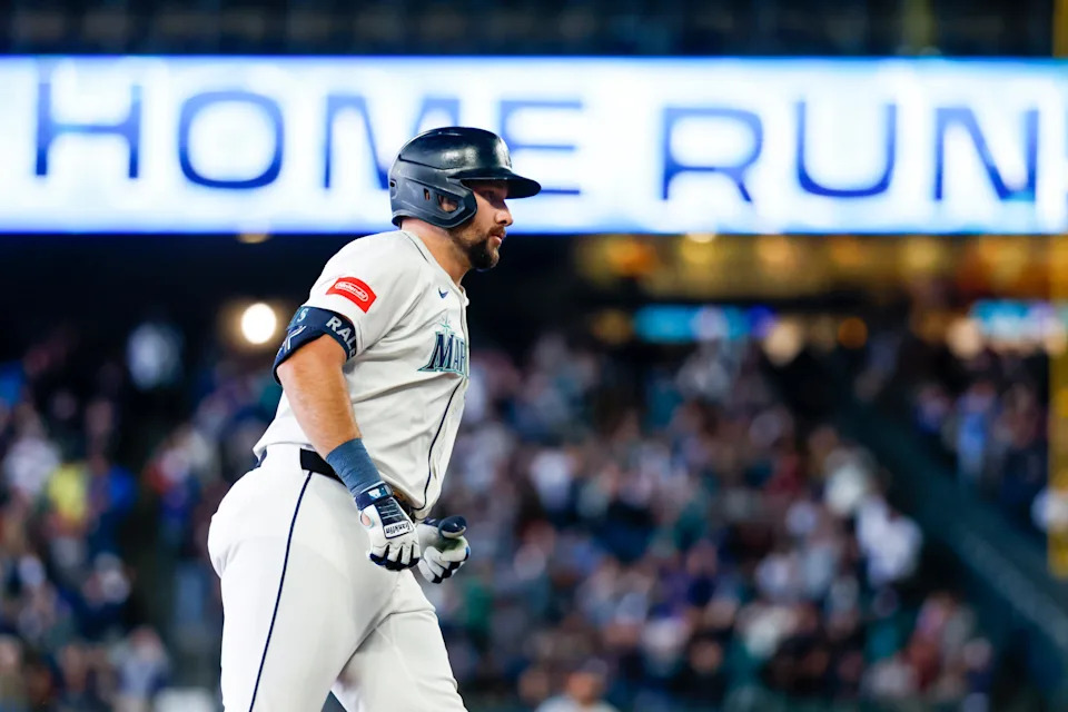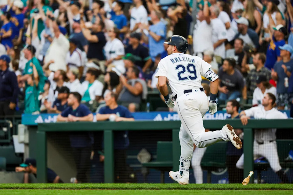 Cal Raleigh of the Seattle Mariners rounds the bases after hitting a two-run home run against the Tampa Bay Rays at T-Mobile Park on August 10, 2025, in Seattle. The first-inning homer marked Raleigh’s 45th of the 2025 MLB season.
