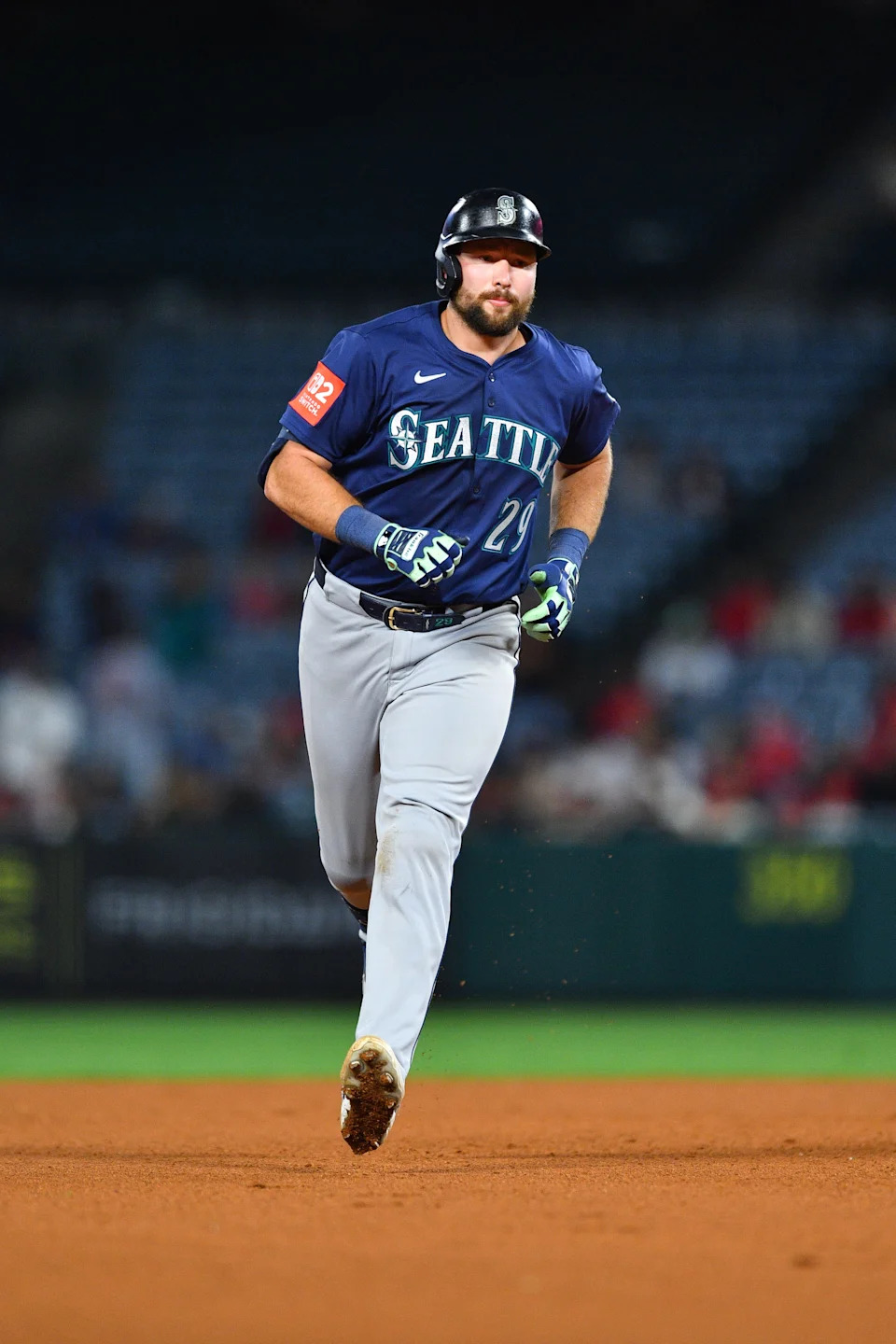 Seattle Mariners catcher Cal Raleigh circles the bases after hitting his second home run of the night against the Los Angeles Angels on June 7, 2025, at Angel Stadium in Anaheim, California. The multi-homer game gave Raleigh 26 home runs on the season.