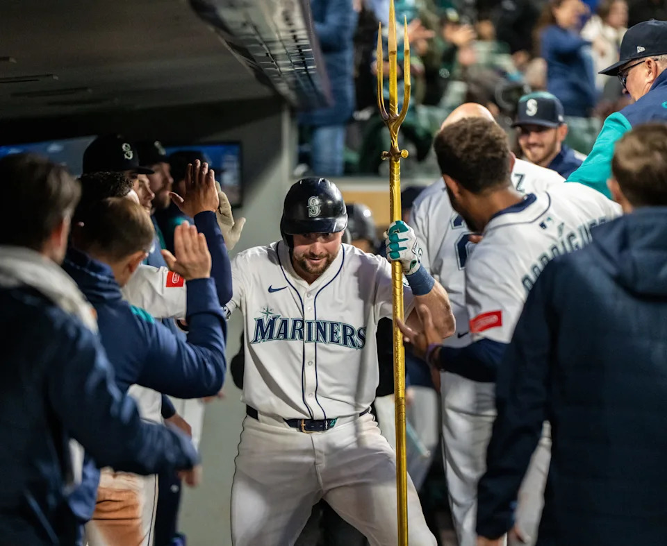 Cal Raleigh of the Seattle Mariners celebrates in the dugout after hitting a home run against the Kansas City Royals at Kauffman Stadium on Sept. 16, 2025. Raleigh’s 55th home run broke Mickey Mantle’s 1961 single season home run record by a switch hitter.