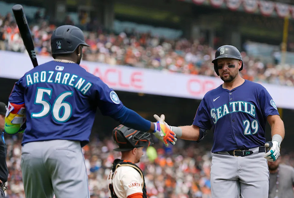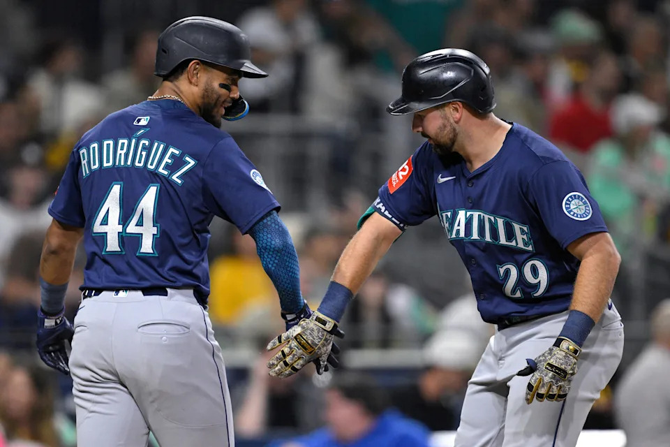 Cal Raleigh of the Seattle Mariners is congratulated by Julio Rodriguez after hitting a two-run home run — his 14th homer of the year — against the San Diego Padres during the sixth inning at Petco Park on May 16, 2025, in San Diego.
