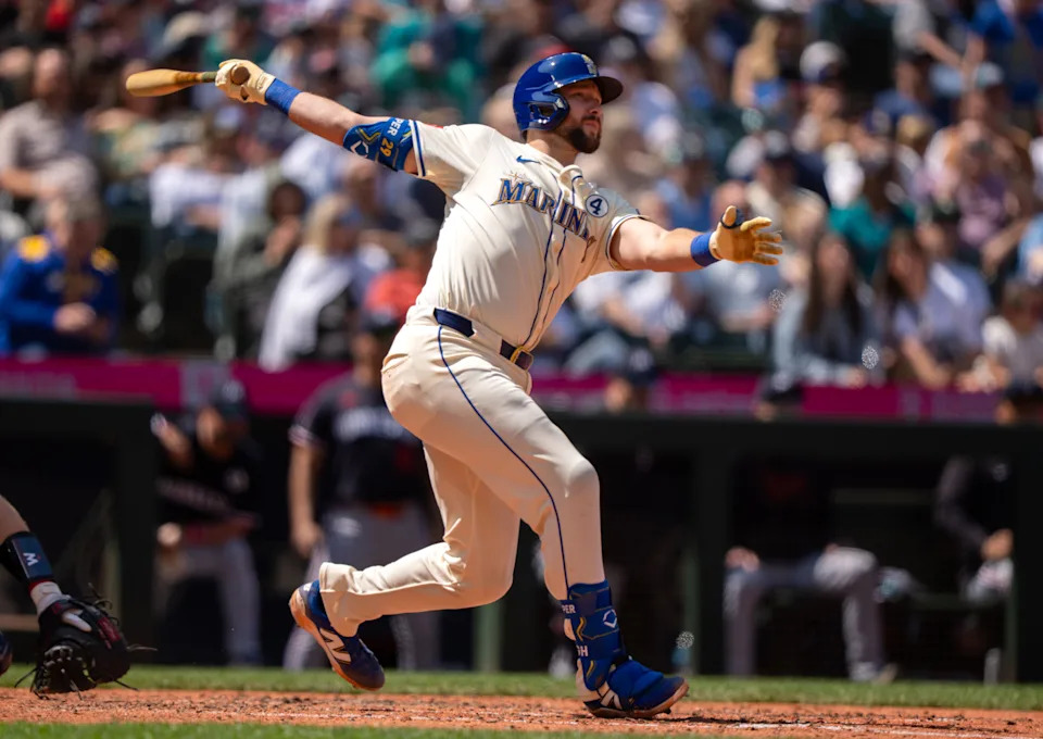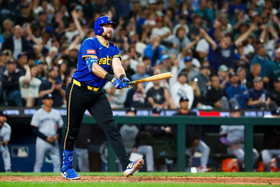 Cal Raleigh of the Seattle Mariners hits a solo home run during the seventh inning of a game against the Minnesota Twins at T-Mobile Park on June 1, 2025, in Seattle, marking his 23rd homer of the year.