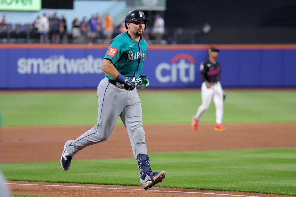 Cal Raleigh rounds the bases after hitting a two-run home run against the New York Mets during the third inning at Citi Field in New York on Aug. 15, 2025, giving the Seattle Mariners catcher 46 homers on the year.