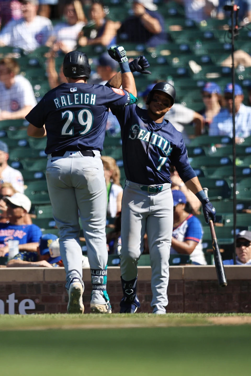 Seattle Mariners designated hitter Cal Raleigh celebrates with shortstop J.P. Crawford after hitting a home run against the Chicago Cubs during the first inning at Wrigley Field in Chicago on June 22, 2025. The two-run blast marked Raleigh’s 31st home run of the year.