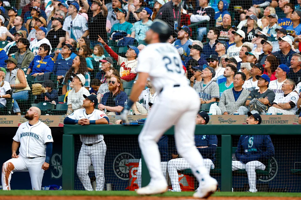Fans and the Seattle Mariners dugout watch a grand-slam home run by catcher Cal Raleigh against the Boston Red Sox during the second inning at T-Mobile Park in Seattle on June 17, 2025, for his 27th home run in 2025.