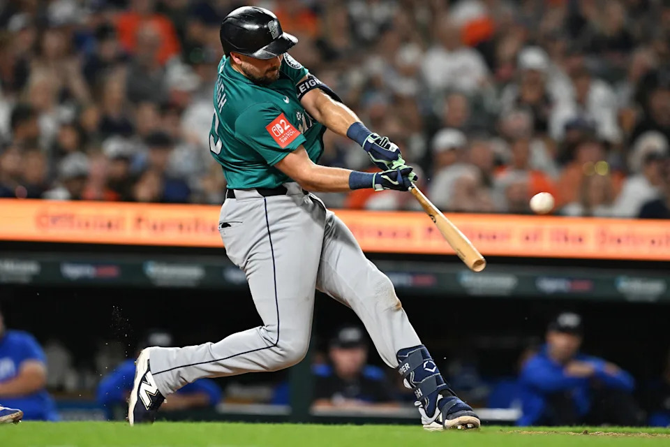 Seattle Mariners designated hitter Cal Raleigh hits a grand slam against the Detroit Tigers in the ninth inning at Comerica Park in Detroit on July 11, 2025. Raleigh’s second home run of the game was his 38th of the season.