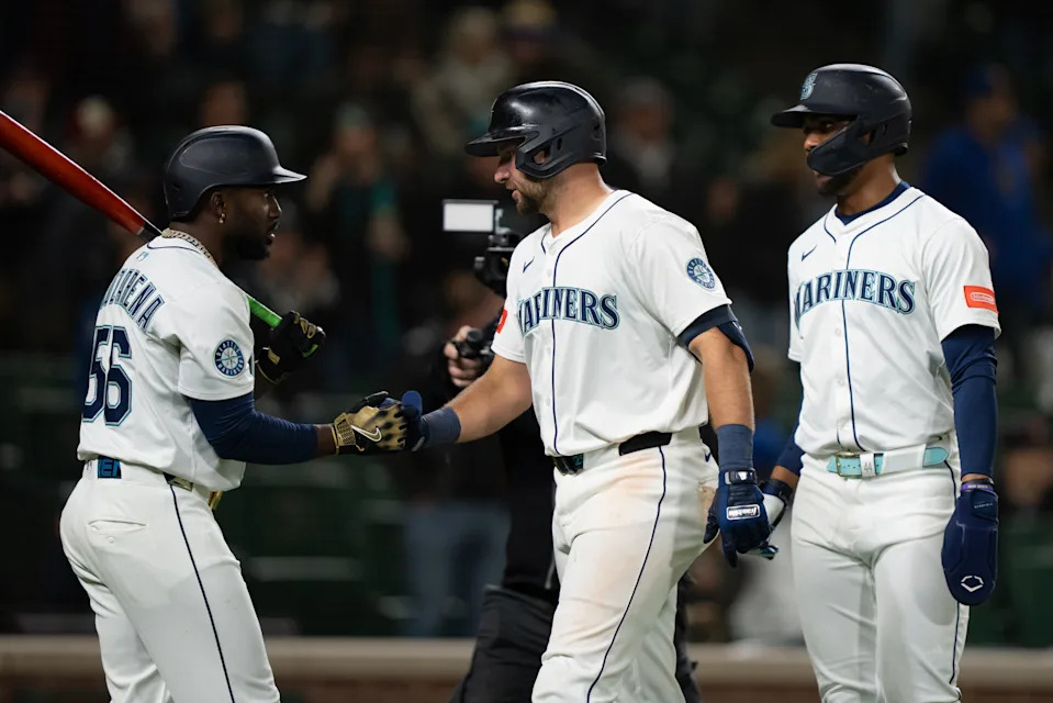 Randy Arozarena of the Seattle Mariners celebrates after beating the Colorado Rockies to clinch a 2025 MLB playoffs berth at T-Mobile Park on Sept. 23, 2025, in Seattle.