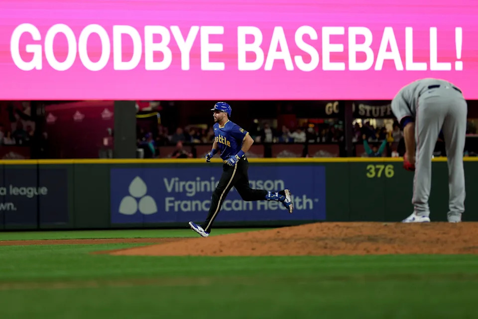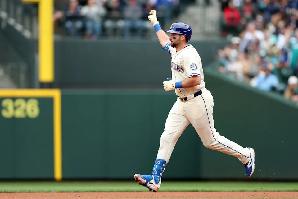 Cal Raleigh runs the bases after hitting a three-run home run against the Minnesota Twins during the first inning at T-Mobile Park in Seattle on May 30, 2025, giving the Seattle Mariners catcher 20 home runs in the 2025 MLB season.