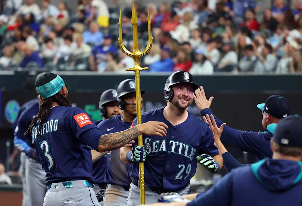 Cal Raleigh of the Seattle Mariners celebrates his home run with teammates while playing against the Detroit Tigers at Comerica Park on July 11, 2025, in Detroit. The eighth-inning blast marked Raleigh’s 37th homer of the year.