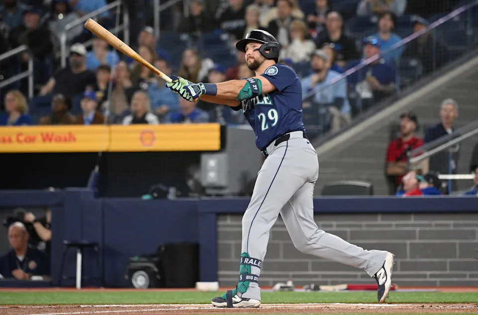 Seattle Mariners catcher Cal Raleigh hits a solo home run — his 33rd homer of the year — against the Kansas City Royals during the seventh inning at T-Mobile Park in Seattle on June 30, 2025.