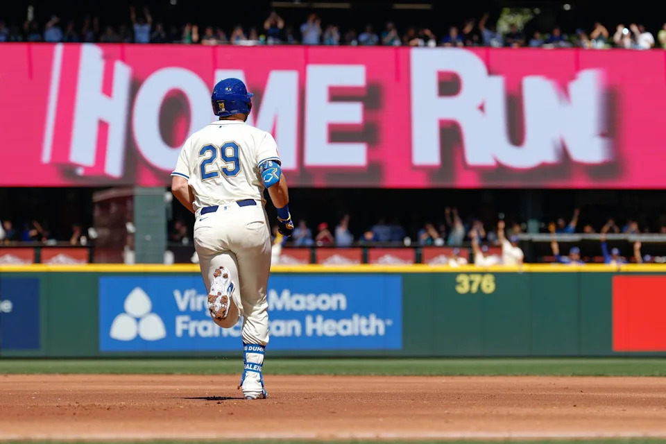 Cal Raleigh hits a solo home run against the Milwaukee Brewers during the sixth inning at T-Mobile Park in Seattle on July 22, 2025, for the Seattle Mariners catcher’s 39th homer of the year.