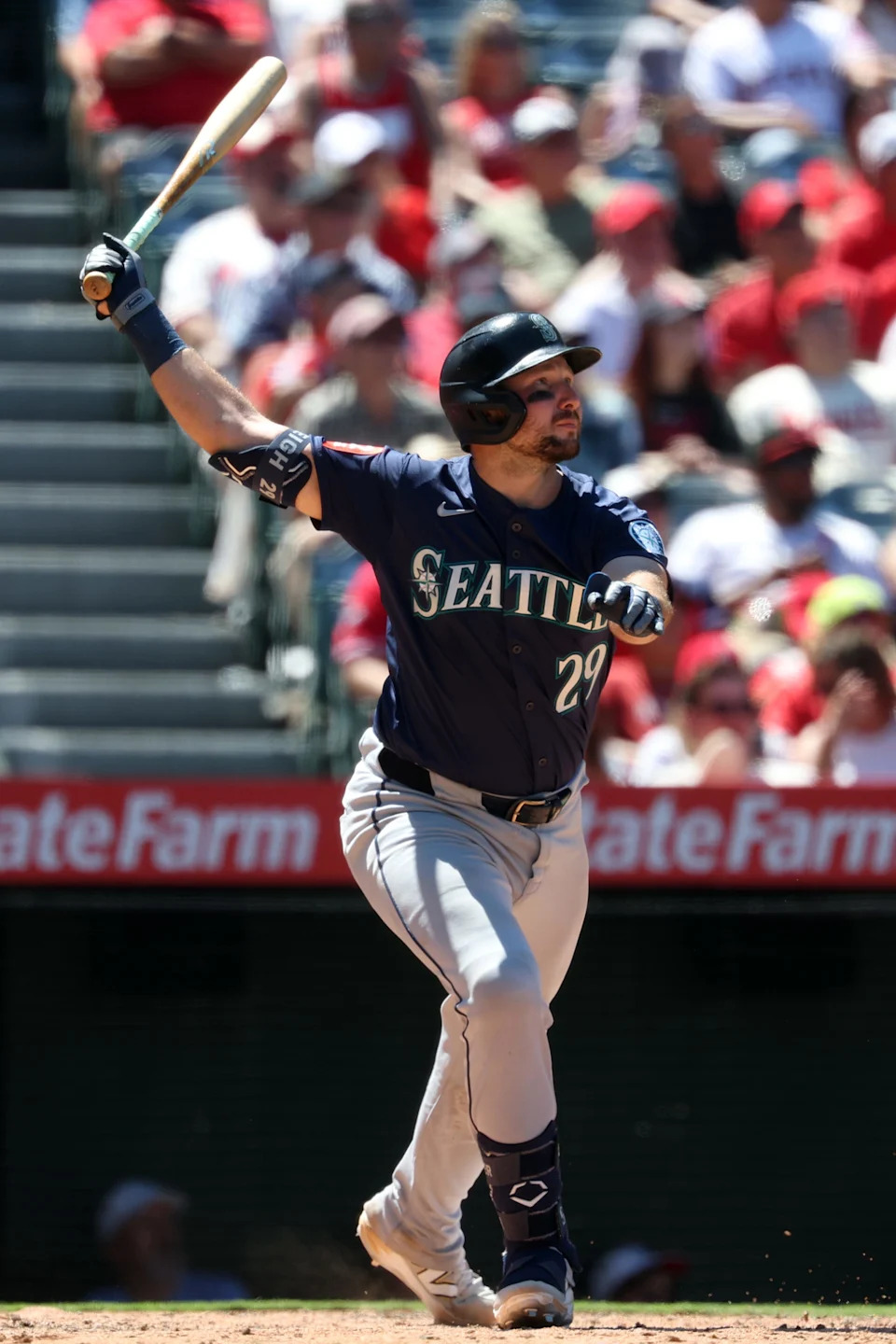 Seattle Mariners designated hitter Cal Raleigh hits a home run — his 40th in 2025 — against the Los Angeles Angels during the sixth inning at Angel Stadium in Anaheim, California, on July 26, 2025.