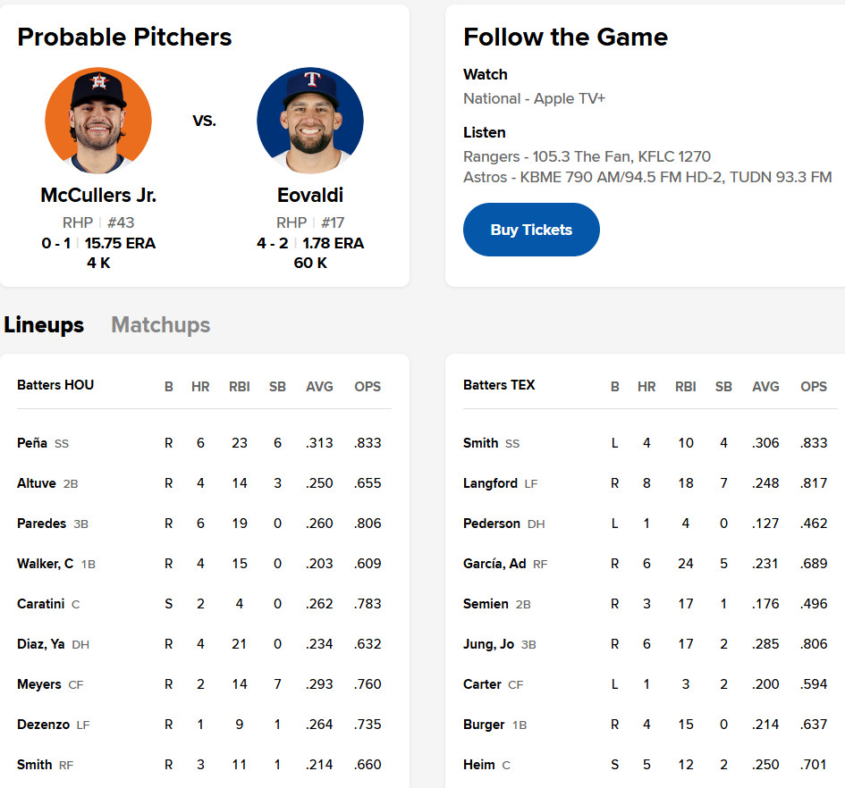 It was tough losing a game like the one Hunter Brown pitched last night. The Rangers were able to bring a revitalized Jacob DeGrom against our ace, and you can’t win if you don’t score. Tonight, the task may be just as tough for Astros hitters against Nathan Eovaldi. But for the Rangers…..? In his last start, his second after a two-year injury hiatus, Lance McCullers looked like he was washed. Can he recover tonight?