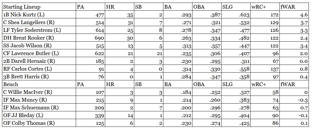 Lawrence Butler has enjoyed the 14th 20/20 season in club history with 21 homers and 21 steals this year. Shea Langeliers has been great in the second half, hitting .319/.360/.646 with 19 home runs in 55 games. Kurtz is hitting .296/.389/.668 with 21 home runs in 56 games at home. Carlos Cortes is hitting .353/.361/.853 with four home runs in his last 15 games. Butler is hitting just .184/.225/.342 against lefties this year. Max Schuemann is hitting just .148/.250/.148 at home.