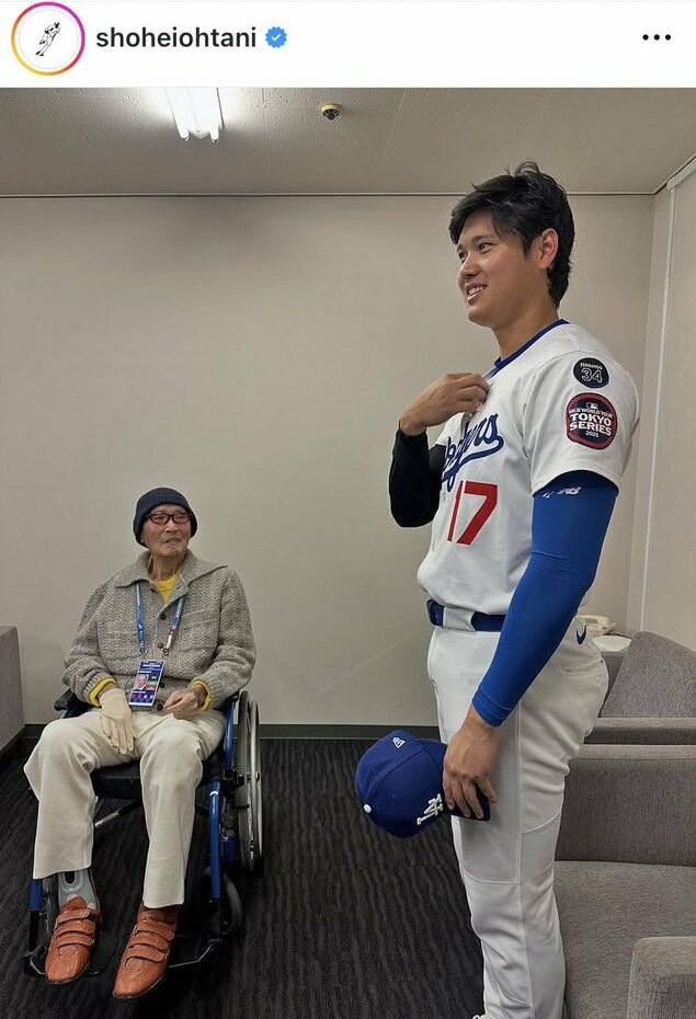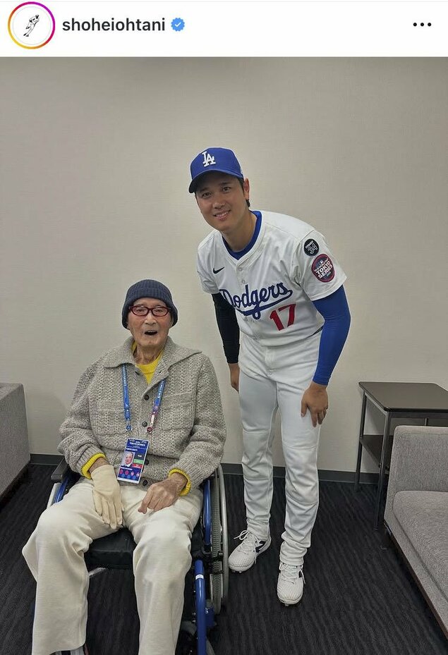 Photo posted on Shohei Ohtani’s Instagram shows him and Shigeo Nagashima (L) together. (Kyodo)