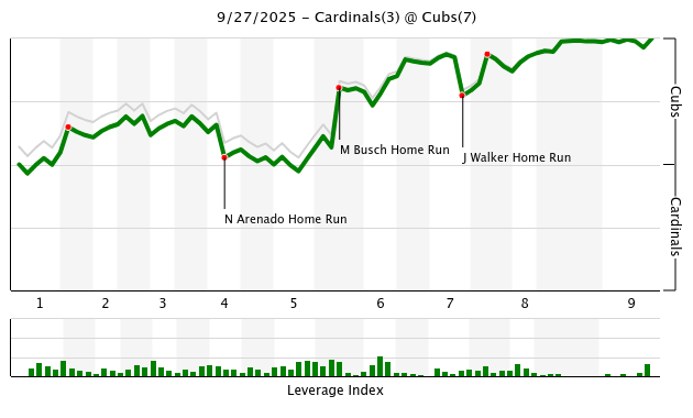 Superhero: Michael Busch (.493). 4-4, 2 HR, 3B, 2B, IBB, 4 RBI, 2 R; 6th best WPA game by a Cub player this season.Hero: Jameson Taillon (.215). 6 IP, 22 BF, 3 H, 2 BB, ER, 8 K (W 11-7)Sidekick: Seiya Suzuki (.086). 1-2, HR, 2 BB, RBI, 2 RBilly Goat: Caleb Thielbar (-.106). IP, 5 BF, 2 H, 2 ER, 2 KGoat: Nico Hoerner (-.078). 0-5Kid: Ian Happ (-.070). 1-4
