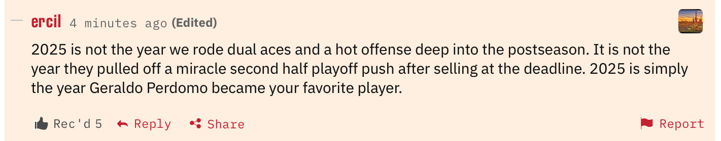 And then, the top of the ninth was upon us, as was the moment we had all been waiting for. Could Geraldo Perdomo do it? Why, yes, ye of little faith, he could and did. Jorge Barrosa singled, Jordan Lawlar managed a ground ball double, and Geraldo Perdomo reached on a fielding error that brought home both Barrosa and Lawlar. Nonetheless, Gerry was granted his 100th RBI, and was promptly met with a big hug from skipper Torey Lovullo, and I believe someone may have been cutting onions in our living room. The game, and the 2025 season, ended with James McCann grounding into a double play that knocked Tim Tawa out at second and McCann out at first.