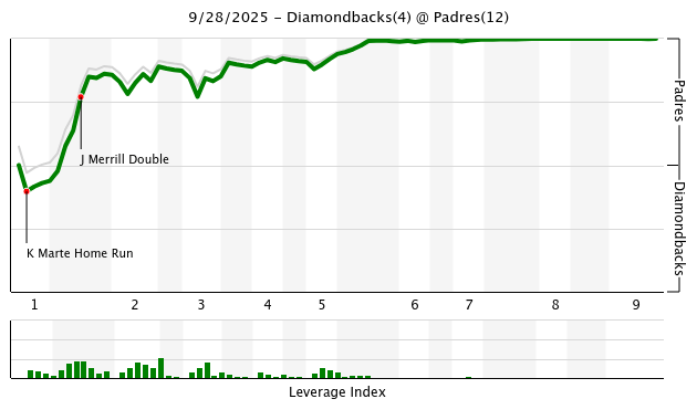 Not, of course, that the rest of the game was a picnic. I said to Dano at one point that I wished I had a less sucky final game to recap. It started with a bang with a Ketel Marte homer. That was nice. Then Brandon Pfaadt, taking the mound in the bottom of the first, promptly gave up five runs. That was not so nice. Pfaadt definitely seems to drop the ball (here all week, folks) when not playing at Chase, and perhaps, as Gonzo pointed out, it has to do with sleeping in an unfamiliar bed and eating different food. Makes a least a particle of sense despite its simplisticness. At any rate, the end of the first saw us down 5-1 PADRES