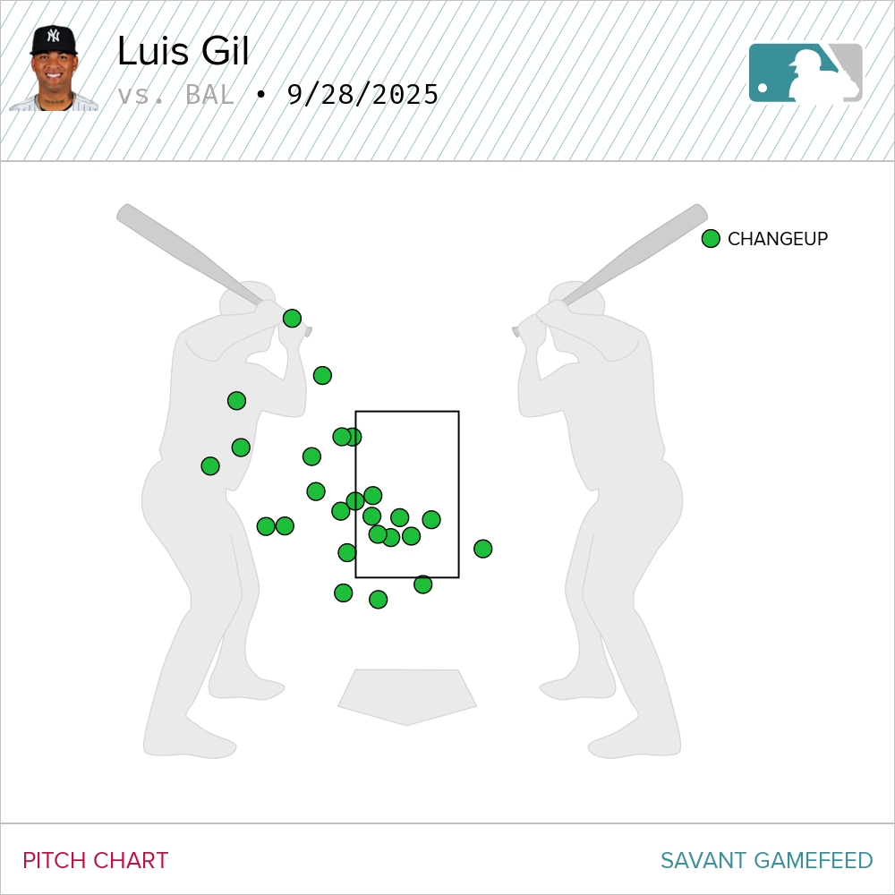 All in all I’m pretty skeptical Luis Gil will be in the postseason rotation for the Yankees, and a move to the bullpen might not even be the right fit given his control issues. He only walked two Orioles, but it took him 79 pitches to get through five innings. Every single at-bat seems to feature two non-competitive pitches, spotting a batter two easy takes per.