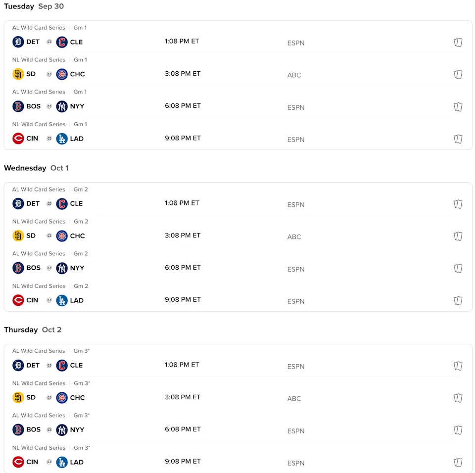 That is the complete schedule for the Wild Card Series and, yes, Red Sox-Yankees will be in the prime time slot, every night: 6 PM on ESPN. If you’re a fan in Detroit, Cleveland, or Chicago, I feel your pain. It sucks that so many of your fellow fans won’t be able to watch the most meaningful innings of your season, even if there is a giddy kind of joy in daytime playoff baseball — in sneaking out of the office to catch a few innings at the bar in the middle of the day, in skipping class or streaming the game on your laptop during your poli-sci lecture.