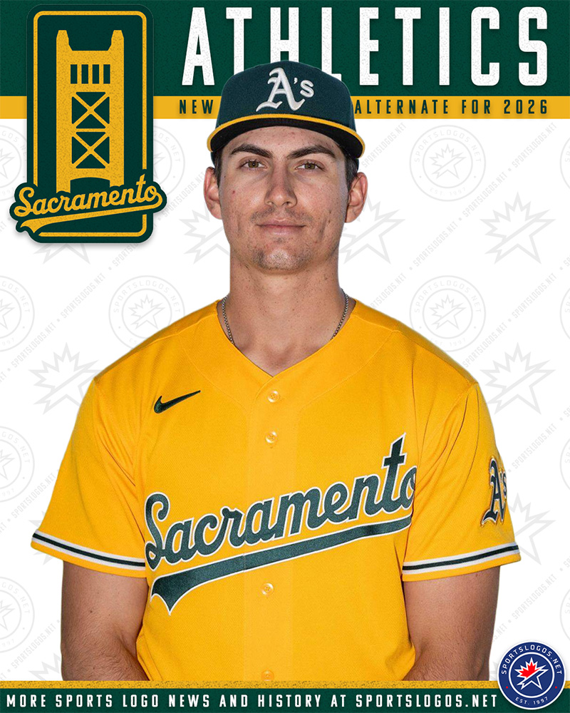 In a surprise unveiling today, the final day of the 2025 season, we unveiled a new yellow/gold alternate jersey for 2026, which will feature “Sacramento” in green script trimmed in white across the chest, accompanied by a green A’s logo on the left sleeve. Green piping, trimmed in white, is located near the end of each sleeve.