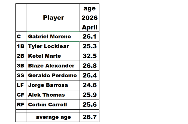 The following table shows my view of the core position players. Their average age of 26.65 years old (data from GanGraphs) at the start of the 2026 season will be two years less than the MLB average of 31.5 years old on opening day rosters at the start of the 2025 season. The Diamondbacks’ youth will keep the window of contention open for years.
