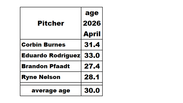 The following table shows the rotation core (Burnes, Nelson, Pfaadt, Rodriguez) for 2026 and 2027. Their average age of 29.95 years old (data from FanGraphs) at the start of the 2026 season is a year and a half under the league average. In 2027, the average will be nearly at league average. Because the other starters and the bullpen are not yet known, the average age of pitchers could change.