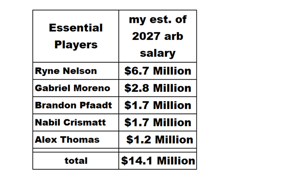 The following table shows the arbitration players that are essential to retain. The estimated 2027 arbitration salaries are optimistically within 20%, but they could be wrong. They were based on my estimate of their performance in 2026, with as assist of this FanGraphs article.