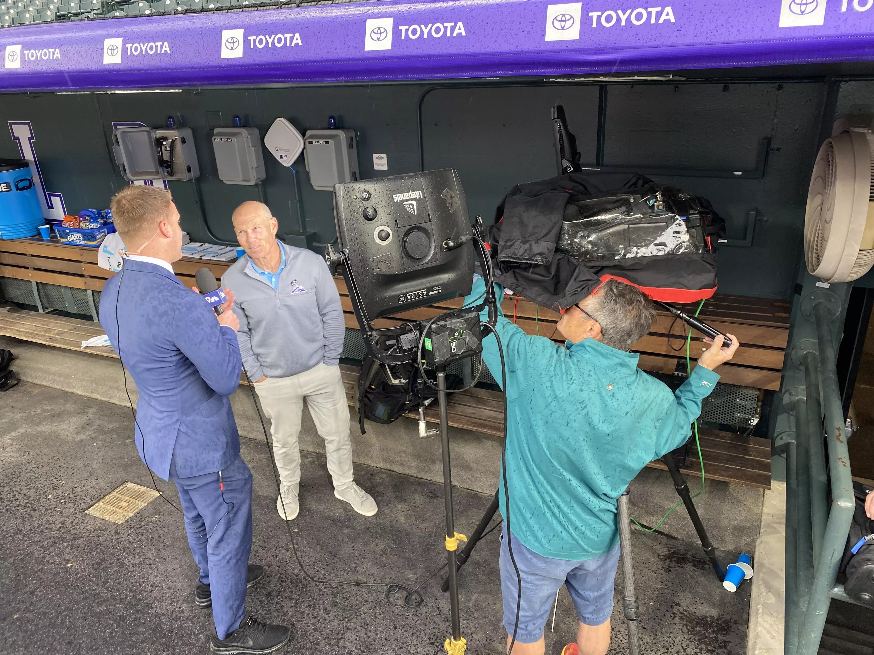 Drew Goodman is interviewed by sportscaster Jon Tritsch for a live spot on 9news about ninety minutes before first pitch.