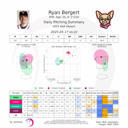 Ryan Bergert threw an impressive start, albeit in abbreviated fashion. The Chihuahuas’ right-hander was efficient and effective, tossing four scoreless innings on 55 pitches. Bergert got seven whiffs on 26 swings against, and his three main pitches (fastball, slider, sweeper) showed impressive shape according to the Stuff+ models. Bergert’s sinker looks to be a pitch he aims to incorporate more, as he threw it three times in the game; he got two whiffs on three sinkers, and the pitch showed impressive two-plane movement, with 12.6 inches of induced vertical break and 14.4 inches of horizontal break on average.