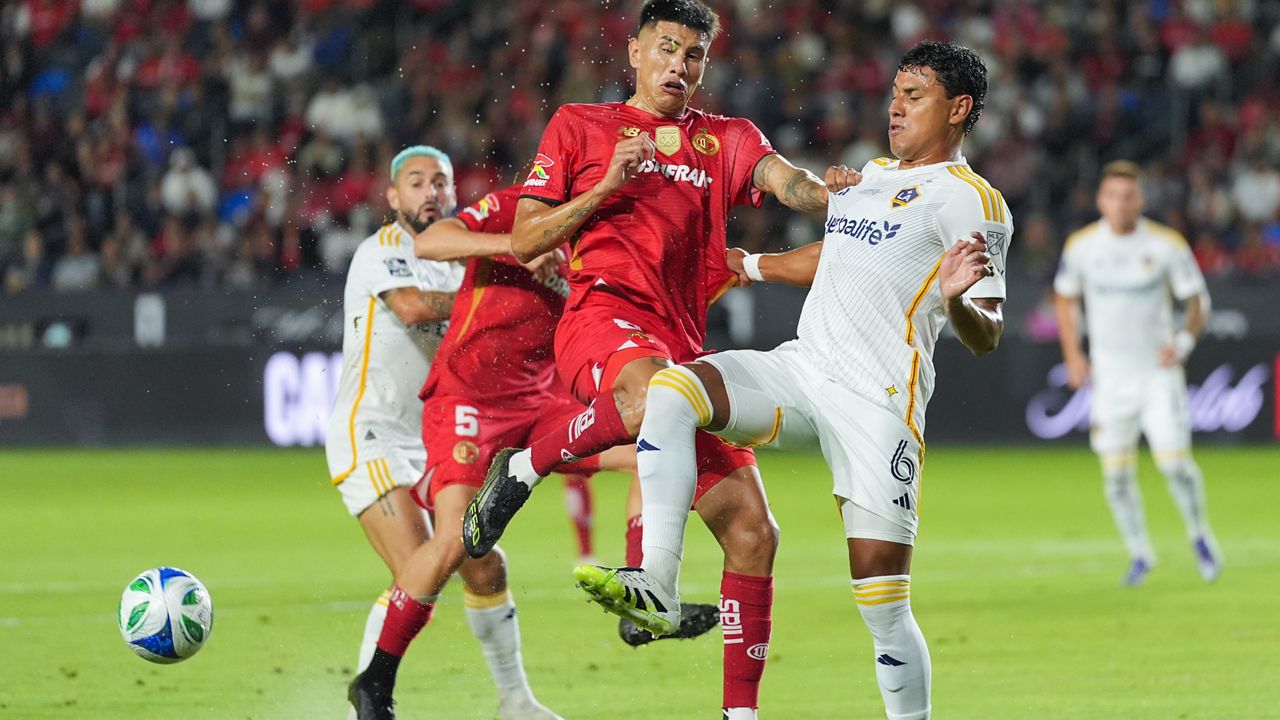 Los Angeles Galaxy’s Edwin Cerrillo (6) kicks the ball away from Toluca’s Nicolas Castro (8) during the first half of a Campeones Cup soccer match on Wednesday in Carson. (AP Photo/Jae C. Hong)