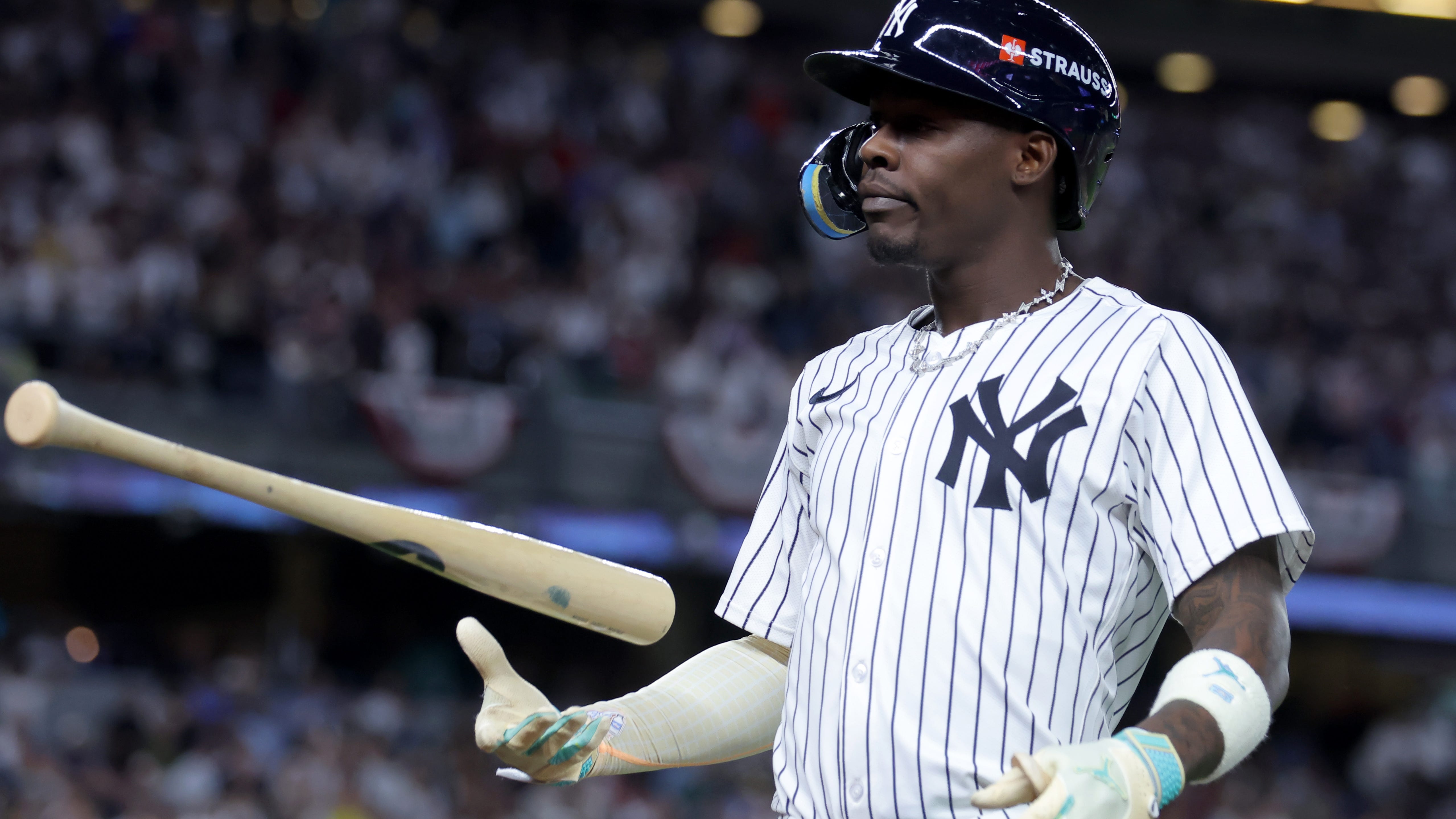 Yankees infielder Jazz Chisholm tells reporters how he cleared his mind after Game 1 loss to Red Sox by beating someone in the video game MLB The Show.