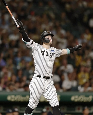 Teruaki Sato of the Hanshin Tigers hits a two-run home run during the fifth inning of an NPB game against Yakult Swallows at Koshien Stadium in Hyogo Prefecture on Oct. 2, 2025. (Kyodo)