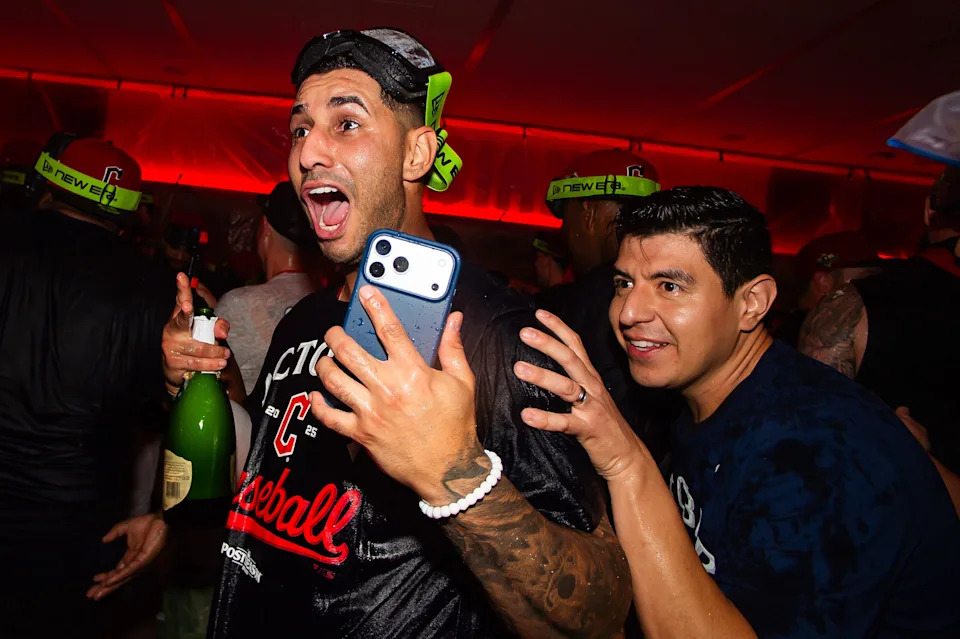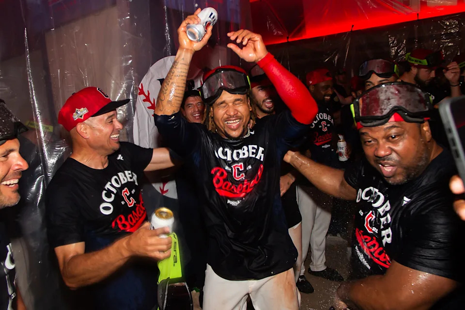Cleveland Guardians players celebrate after the Guardians beat the Texas Rangers to secure a playoff berth on Sept. 27 at Progressive Field.