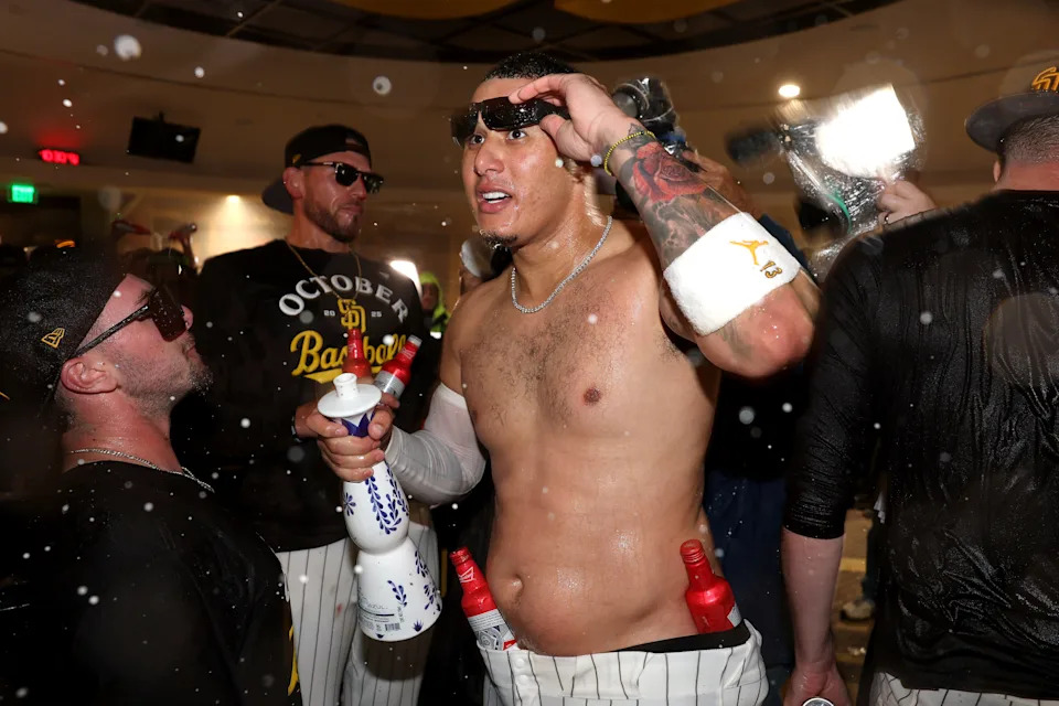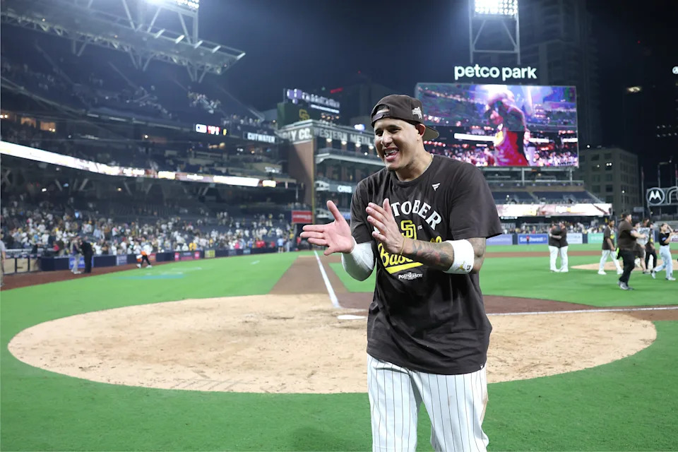 Manny Machado of the San Diego Padres celebrates after defeating the Milwaukee Brewers to clinch a berth in the 2025 MLB playoffs at Petco Park on Sept. 22, 2025, in San Diego.