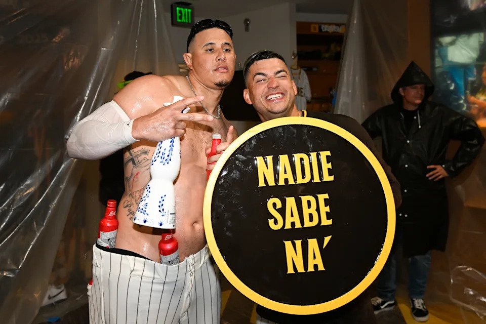Jasson DomiÂnguez of the New York Yankees celebrates in the locker room after clinching a 2025 MLB playoffs spot in a walk-off win against the Chicago White Sox at Yankee Stadium on Sept. 23, 2025, in New York.