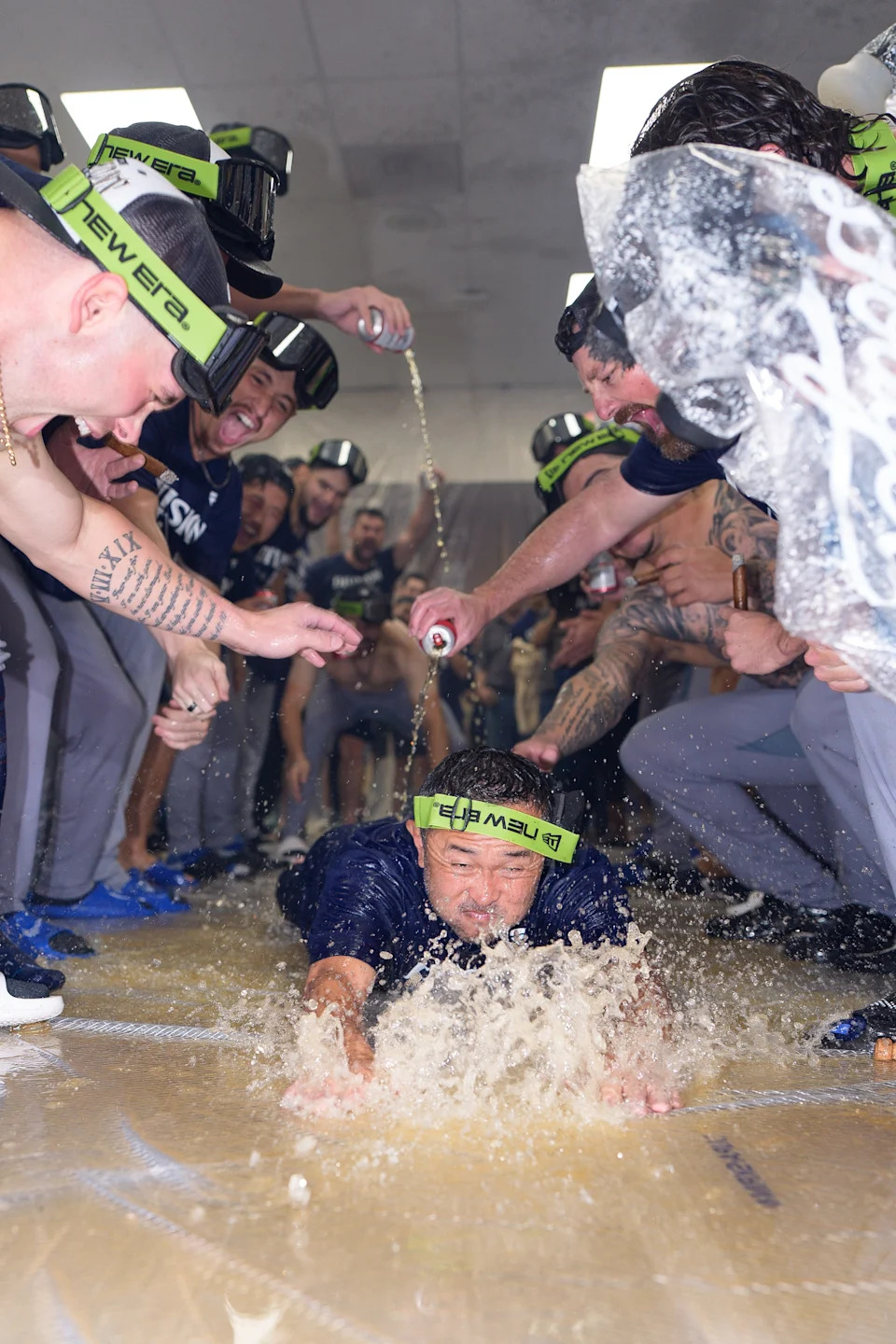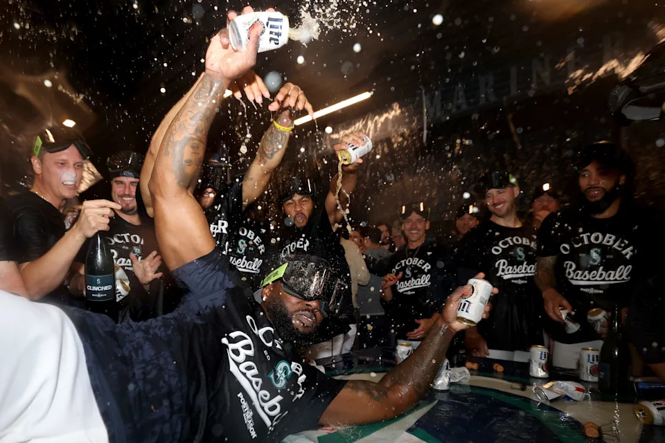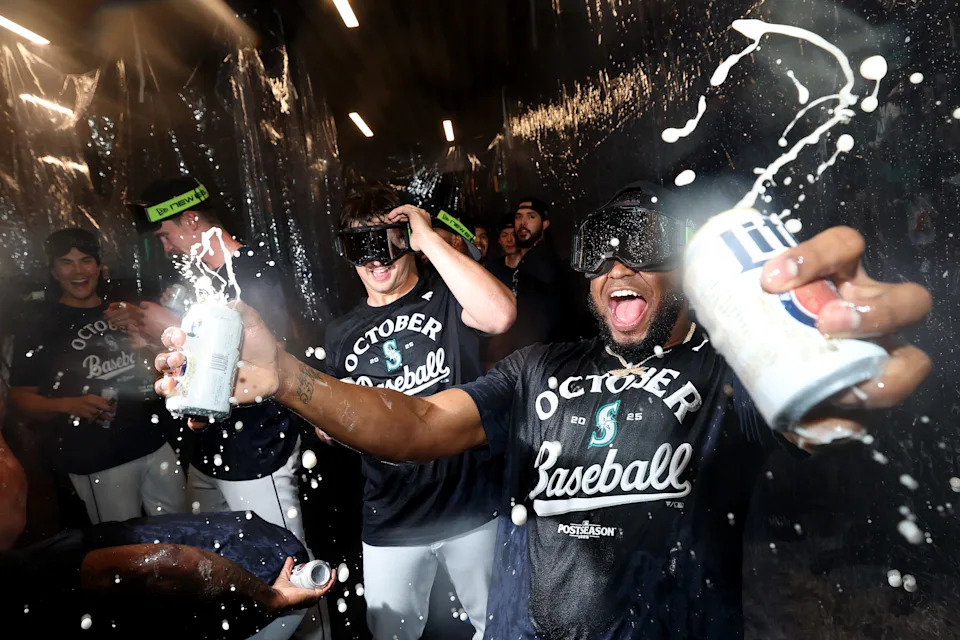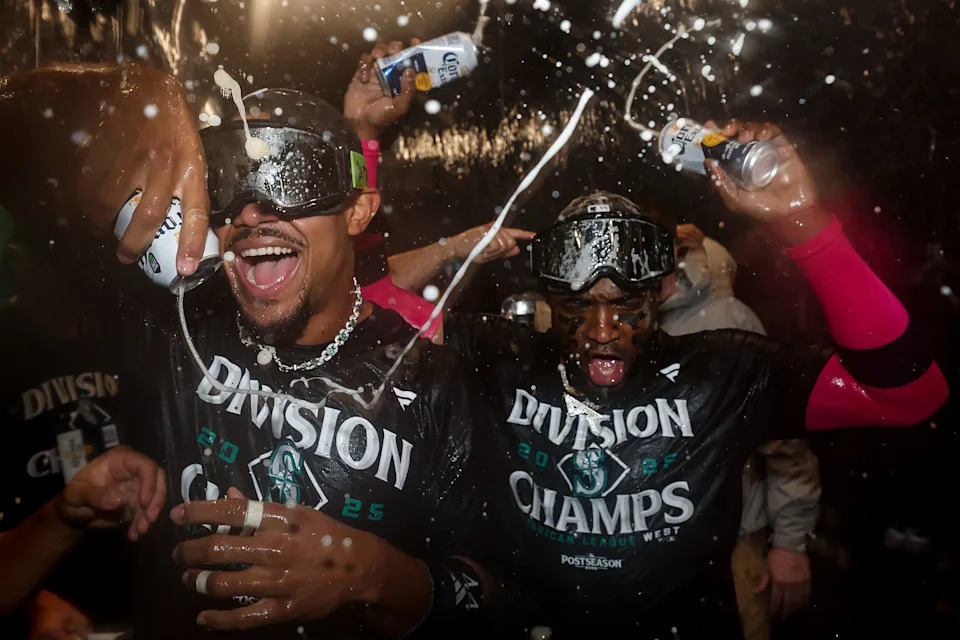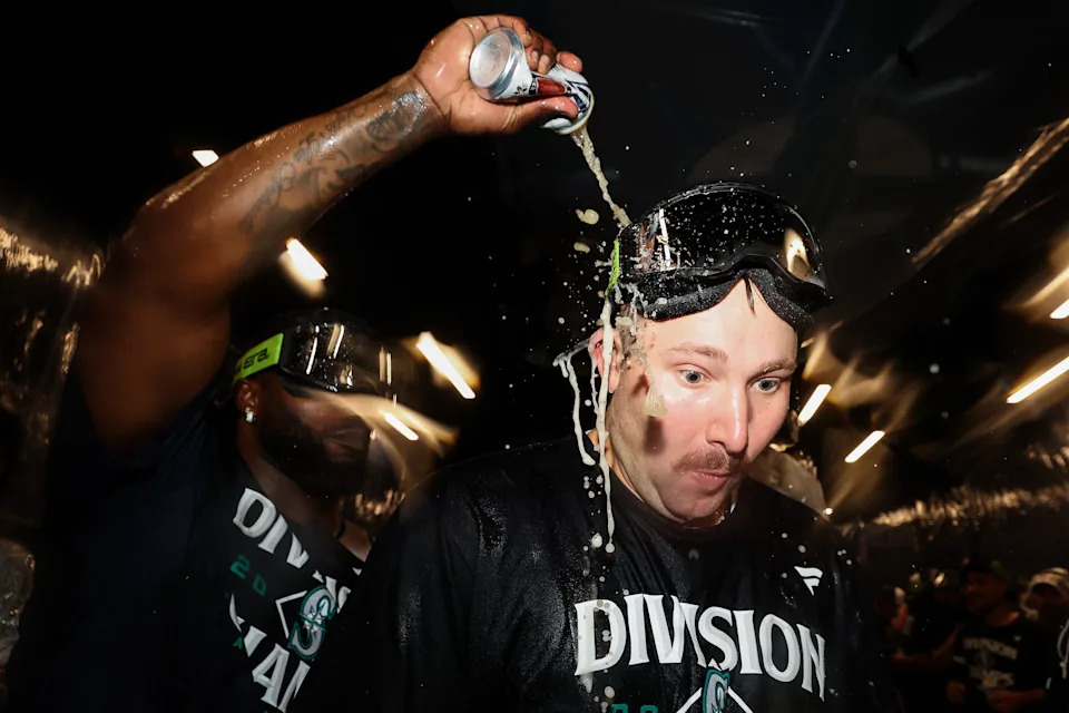 Seattle Mariners outfielder Randy Arozarena douses catcher Cal Raleigh after winning the AL West division title with a win over the Colorado Rockies at T-Mobile Park in Seattle on Sept. 24, 2025.