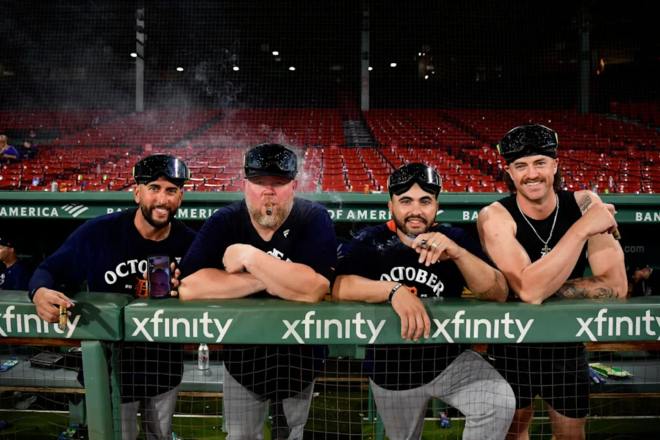 The Detroit Tigers celebrate clinching a playoff berth after defeating the Boston Red Sox on Sept. 27 at Fenway Park.