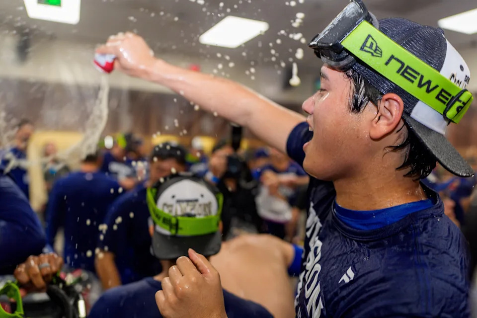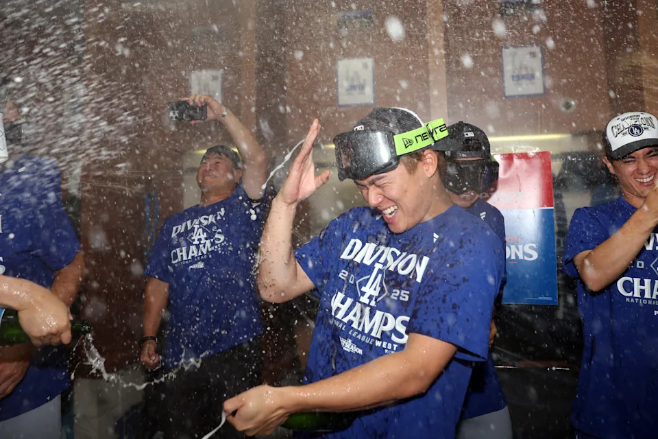 Yoshinobu Yamamoto of the Los Angeles Dodgers celebrates in the locker room after defeating the Arizona Diamondbacks 8-0 to clinch the NL West division title at Chase Field on Sept. 25, 2025 in Phoenix.