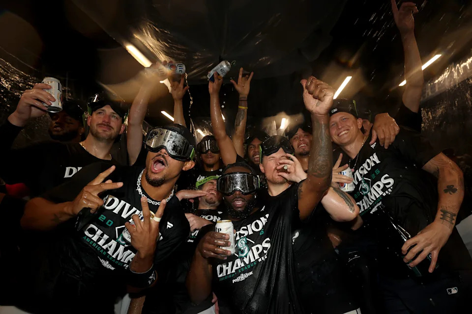 The Seattle Mariners celebrate after winning the AL West division title with a win over the Colorado Rockies at T-Mobile Park in Seattle on Sept. 24, 2025.