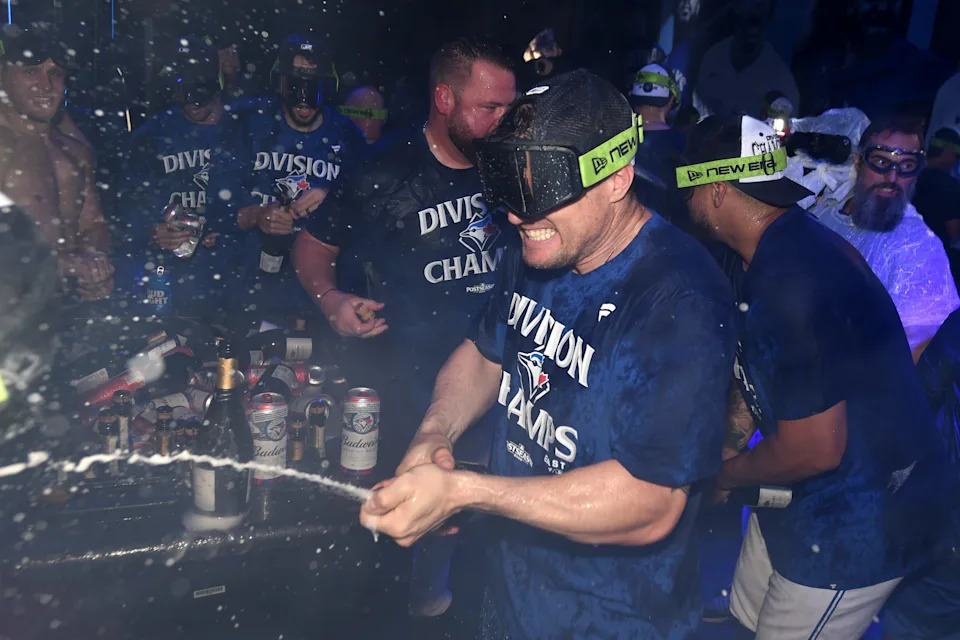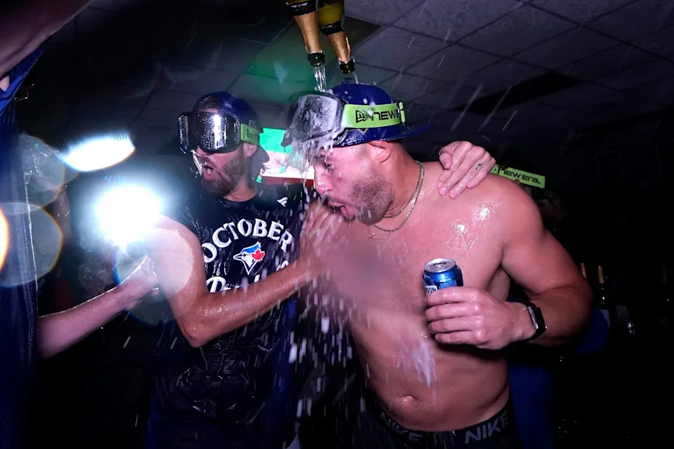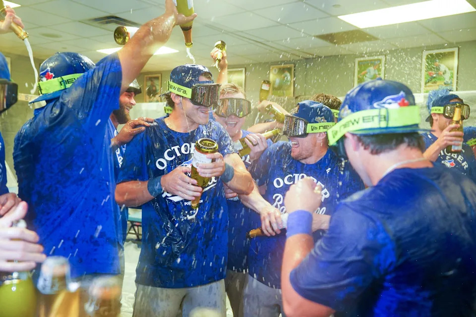 Toronto Blue Jays players celebrate in the locker room after clinching a spot in the 2025 MLB playoffs with a win over the Kansas City Royals at Kauffman Stadium on Sept. 21, 2025.