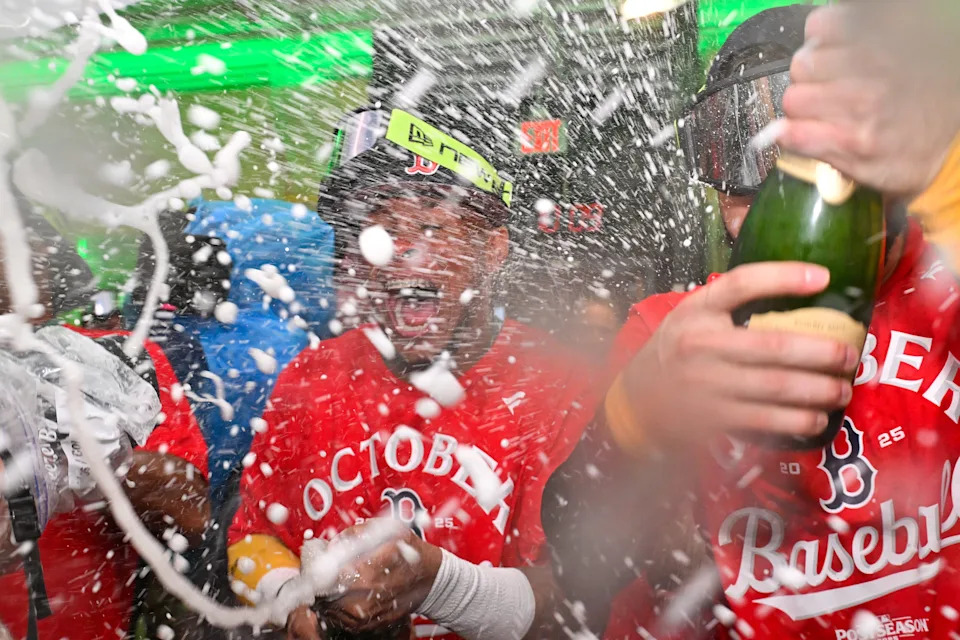Jarren Duran of the Boston Red Sox celebrates in the clubhouse after defeating the Detroit Tigers during the ninth inning at Fenway Park to clinch a spot in the 2025 MLB postseason on Sept. 26, 2025, in Boston.