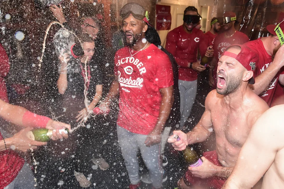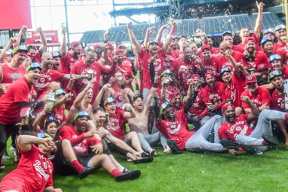 Cincinnati Reds players celebrate after clinching a wild card spot on Sept. 28.
