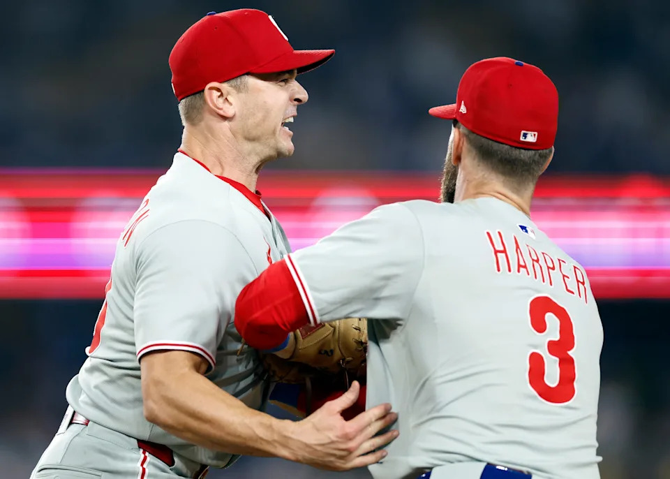 Bryce Harper of the Philadelphia Phillies celebrates with Harrison Bader after clinching the NL East division title after defeating the Los Angeles Dodgers 6-5 at Dodger Stadium on Sept. 15, 2025, in Los Angeles.