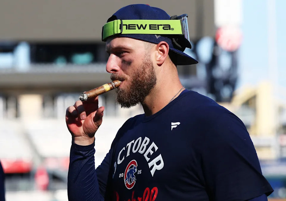Justin Turner of the Chicago Cubs smokes a cigar to celebrate the team clinching a spot in the 2025 MLB playoffs on Sept. 17, 2025, after an 8-4 win over the Pittsburgh Pirates at PNC Park in Pittsburgh.