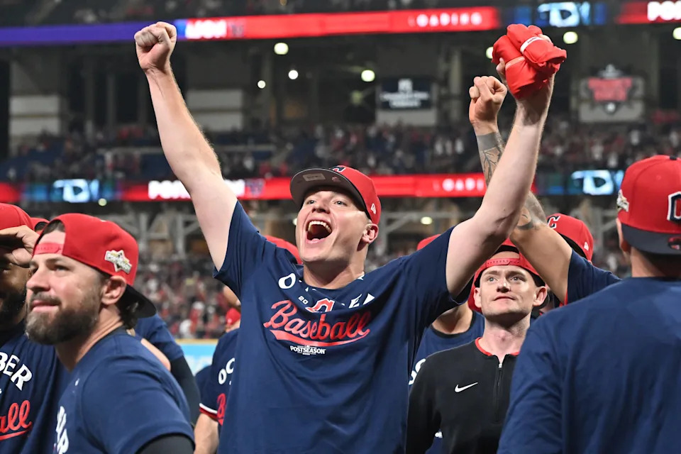Cleveland Guardians starting pitcher Parker Messick celebrates after the Guardians beat the Texas Rangers to secure a playoff berth on Sept. 27 at Progressive Field.