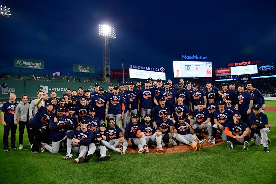 The Detroit Tigers pose for a team photo after clinching a playoff berth by defeating the Boston Red Sox on Sept. 27 at Fenway Park.