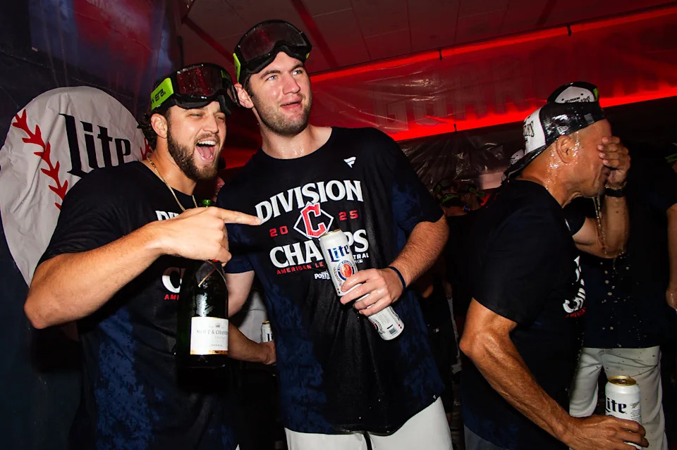 Cleveland Guardians starting pitchers Slade Cecconi and starting pitcher Gavin Williams, middle, celebrate after the Guardians won the American League Central Division on Sept. 28 at Progressive Field.