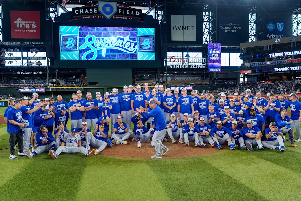 The Los Angeles Dodgers celebrate their National League West championship after a game against the Arizona Diamondbacks at Chase Field on Sept. 25, 2025.